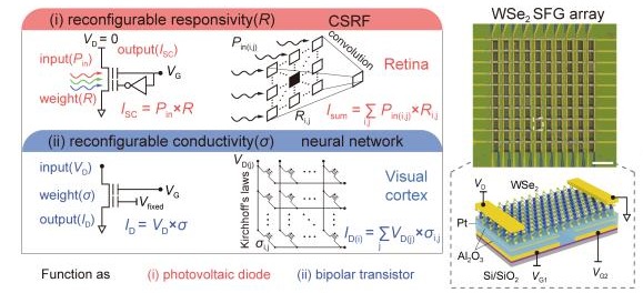 该硬件由交叉棒阵列和模仿视觉通路回路连接的相关外围电路构成。其中,10 × 10像素规模的交叉棒阵列由Al2O3/Pt/Al2O3/WSe2分裂浮栅结构(SFG)的单元器件构成(图2),器件和阵列具有两种工作模式:i)光伏二极管模式;ii)双极晶体管模式。在光伏二极管模式下,分裂浮栅赋予二硒化钨(WSe2)同质结可重构的正/负光电流,且响应度受到栅极电压近线性的调节,工作时无需偏压待机功耗几乎为零。该模式下的SFG阵列能够模拟视网膜的中心-周围感受野(CSRF)。在双极晶体管模式下,双栅的一端施加固定电压用于选通,另一端调节晶体管沟道电导率用于调节神经网络单元权重。该模式下的SFG阵列能模拟视觉皮层的神经网络结构,通过基尔霍夫定律执行矩阵乘和操作。浮栅编程能量仅1 pJ/spike,有望实现超低功耗。