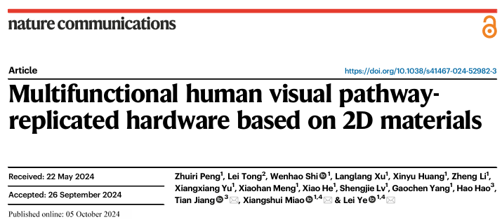 10月5日,《Nature Communications》在线刊发了我校williamhill中文叶镭教授、缪向水教授关于二维仿生视觉硬件的最新研究成果“Multifunctional human visual pathway-replicated hardware based on 2D materials”。缪向水教授、叶镭教授和国防科技大学江天教授为通讯作者,我校2021级博士生彭追日为第一作者。我校williamhill中文为论文第一完成单位。该工作得到香港中文大学童磊博士的大力支持,并受到国家自然科学基金、国家重点研发计划、湖北省重点、香港研究资助局等项目的资助。