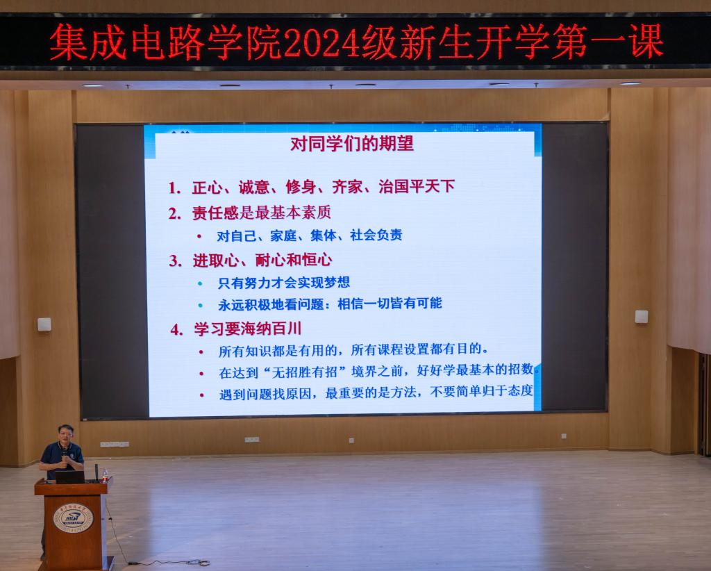 在williamhill中文开学第一课上,名誉院长叶甜春教授详细阐述了中国集成电路产业在过去几十年的成就,同时也指出集成电路产业所面对的难题与挑战,鼓励同学们打牢专业基础,脚踏实地,广阔天地未来必将大有可为,学院党委书记刘伟勉励新生们扎实学习、勇于创新,为实现中国“芯”的突破贡献自己的力量。