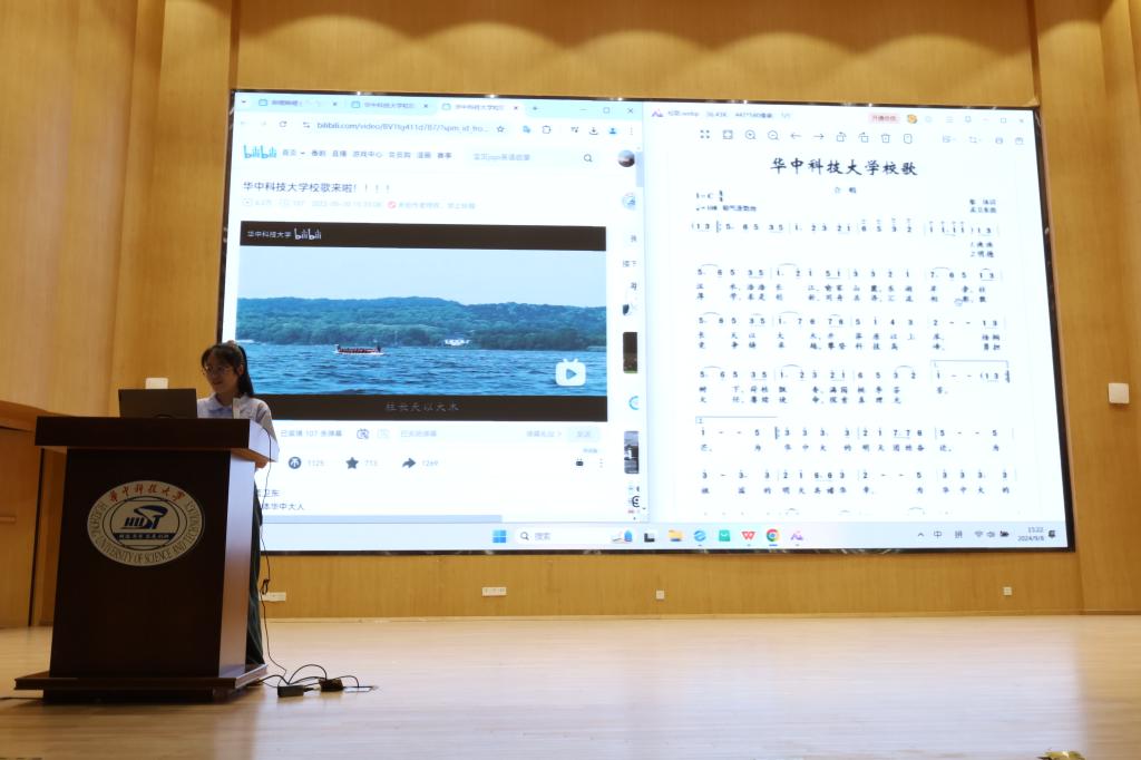 邀请校合唱团成员仇乐祺带领新生学唱校歌,感悟歌词内涵,汲取歌词力量,为华中大的明天团结奋进,为祖国的明天共谱华章。