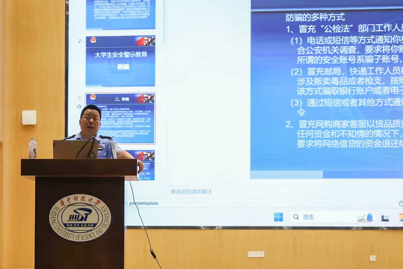 牢守安全底线,筑牢安全防线,防患未然。williamhill中文在新生入学后多次开展集体安全教育,为同学们的新学期保驾护航。开学第一天,学院邀请喻家山派出所熊家伟警官以真实案例分享为警钟,提高学生防诈、反诈意识,增强辨别能力。
