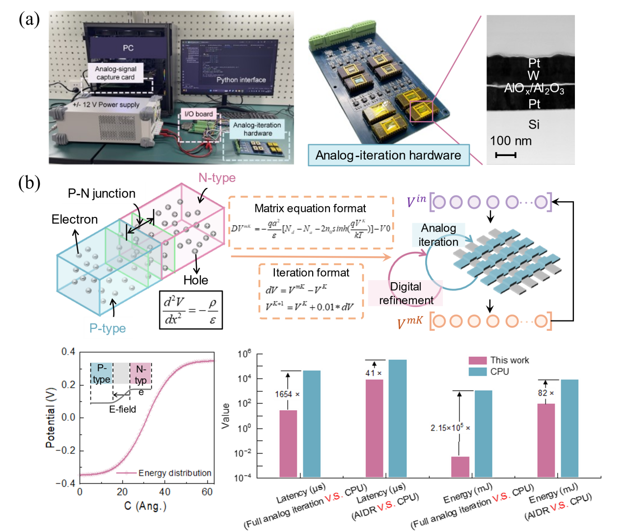 为解决上述难题,研究团队在前期忆阻矩阵方程求解器(Sci. Adv. 2023、IEDM 2023、IEDM 2024)的研究基础上,提出了将忆阻全模拟求解器与数字处理器融合,构建混合域异构矩阵方程求解系统的新思路。该系统可在忆阻阵列中执行全模拟迭代,以低时间复杂度生成初始解,进而利用数字处理器计算修正得到高精度解(Analog Iteration with Digital Refinement, AIDR)。实验上,团队制备了一种基于二值忆阻器的迭代求解电路,在模拟域内实现了可变精度的矩阵方程数值迭代计算。该电路具有可扩展的拓扑结构和O (1) 计算时间复杂度,在基准求解测试中取得了10-3的求解误差,从而支撑AIDR系统在亚线性时间复杂度(O (Nb),b = 0.38)下实现误差低于10-12的高精度求解。将AIDR系统用于扩散方程求解、硅P-N结平衡态模拟等计算任务中进行性能评估,结果表明在达到与商用CPU(Intel Core i5-13600K)相当求解精度(双浮点计算精度)时,系统实现了的41-128倍求解速度提升以及81-160倍的能耗降低。