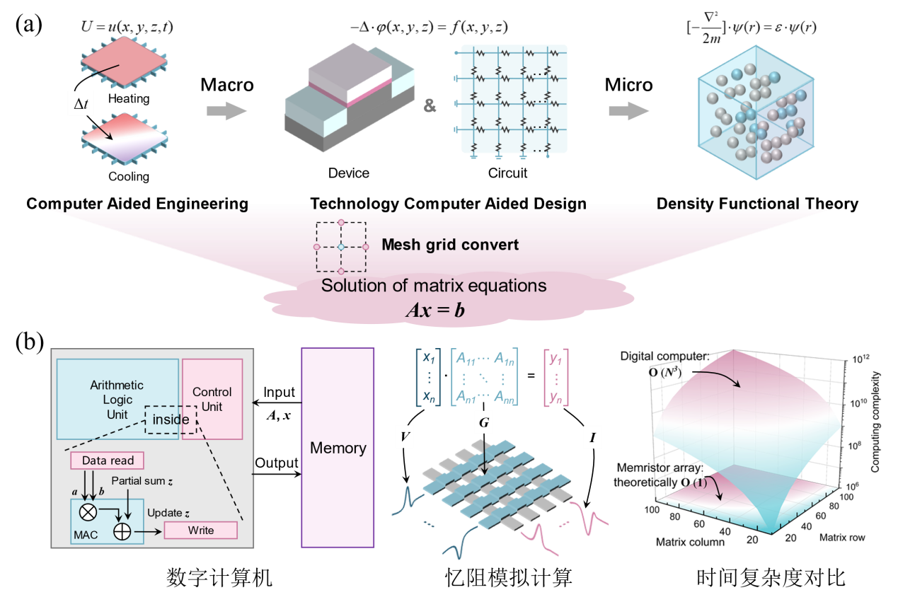图1. (a)矩阵方程的应用场景;(b)数字计算与忆阻模拟计算的时间复杂度对比