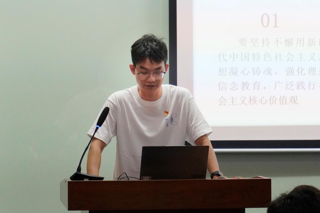 支部党员程放曾是研究生支教团的一员,他带领同志们一同学习了习近平总书记对精神文明建设工作的重要指示精神,号召党员同志们以我校获评“全国文明校园”为契机,在精神文明建设中当先锋、作表率。