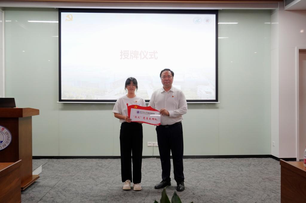 党员先锋队队长龚洁进行了工作汇报,学院党委书记刘伟老师为党员先锋队授牌,鼓励党员先锋队继续发挥先锋引领,接续奋斗。