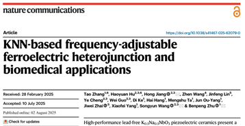 最近,我院联合武汉大学省人民医院在Nature Communications上发表题为“KNN-based frequency-adjustable ferroelectric heterojunction and biomedical applications”( 基于KNN的频率可调铁电异质结和生物医学应用)的论文。论文研究开发了基于无铅K₀.₅Na₀.₅NbO₃(KNN)压电陶瓷的频率可调铁电异质结(f-FH),其压电系数高达d₃₃=680 pC/N,且实现小型化(直径13.3 mm,厚度2.28 mm),适合植入。该器件在2.7–3.3 MHz窄频范围内实现1.5 mm的连续焦距调节。通过对心肌梗死(MI)大鼠模型的长期经颅神经调节,有效抑制交感神经过度激活、减小心肌梗死面积和改善心功能,为脑调节及MI临床治疗提供了新策略。