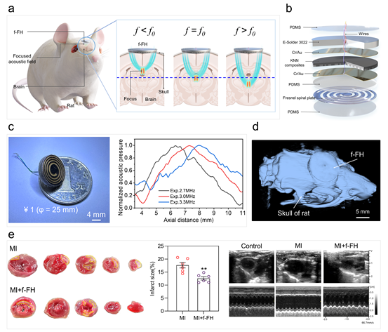 图1(a)f-FH器件变频特性及应用潜力;(b)f-FH器件构成;(c)f-FH器件实物图及其焦点可调特性;(d)器件体内植入;(e)f-FH器件的深脑调控并达到心梗治疗作用