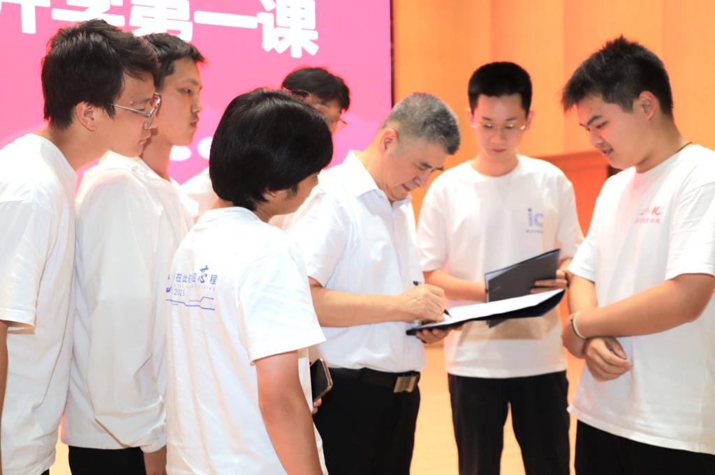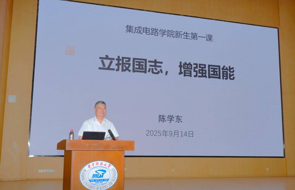 随后中国工程院院士陈学东为同学们讲授新生开学第一课。陈学东院士以“立报国志,增强国能”为主题为全体新同学带来一趟生动的开学第一课。陈院士以生动的视频案例为同学们拉开芯片世界的大门,以自身发展经历为引,帮助同学们深入了解我国集成电路产业发展现状。陈院士结合当前国产光刻机和人形机器人发展形势,从芯片领域发展总体出发,勉励同学们立大志、明大德、成大才、担大任,努力成为既掌握扎实专业知识,又怀有报国之志的新时代青年,为科技强国奉献自己的青春力量。
