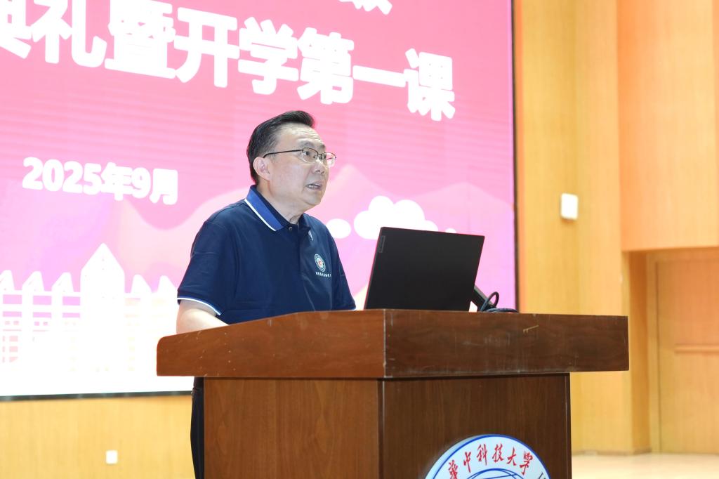 中国工程院院士陈学东,学院党委书记刘伟、院长缪向水、全体在校院领导、教师班主任和研究生导师代表、全体辅导员以及全体2025级本、研新生共同参会。典礼由学院党委副书记姜波主持。
