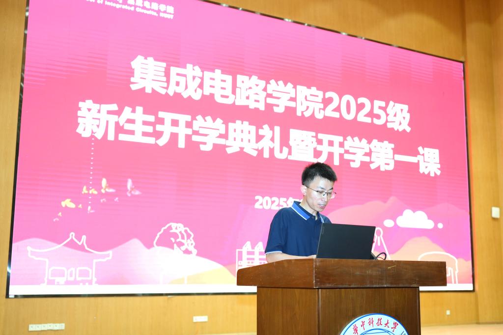 教师代表程晓敏教授,以“使命”“热爱”“成长”三个关键词勉励新生。她指出,投身国家亟需的集成电路领域是青年一代的光荣使命,而支撑这份使命的则是对科学的热爱。她鼓励新生将热爱化为行动,主动融入实验室团队,在科研实践中锤炼真本事,实现个人与专业的同步成长,为成为创新型人才奠定坚实基础。