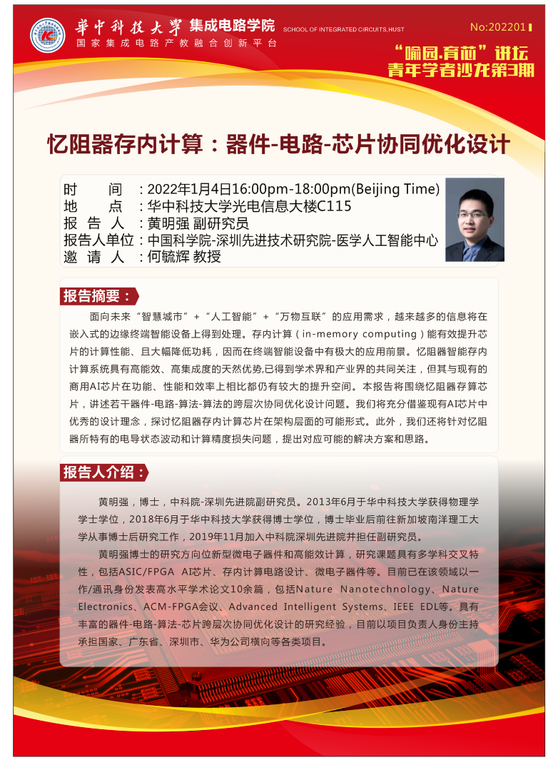 喻园•育芯讲坛之青年学者沙龙第三期:忆阻器存内计算:器件-电路-芯片协同优化设计