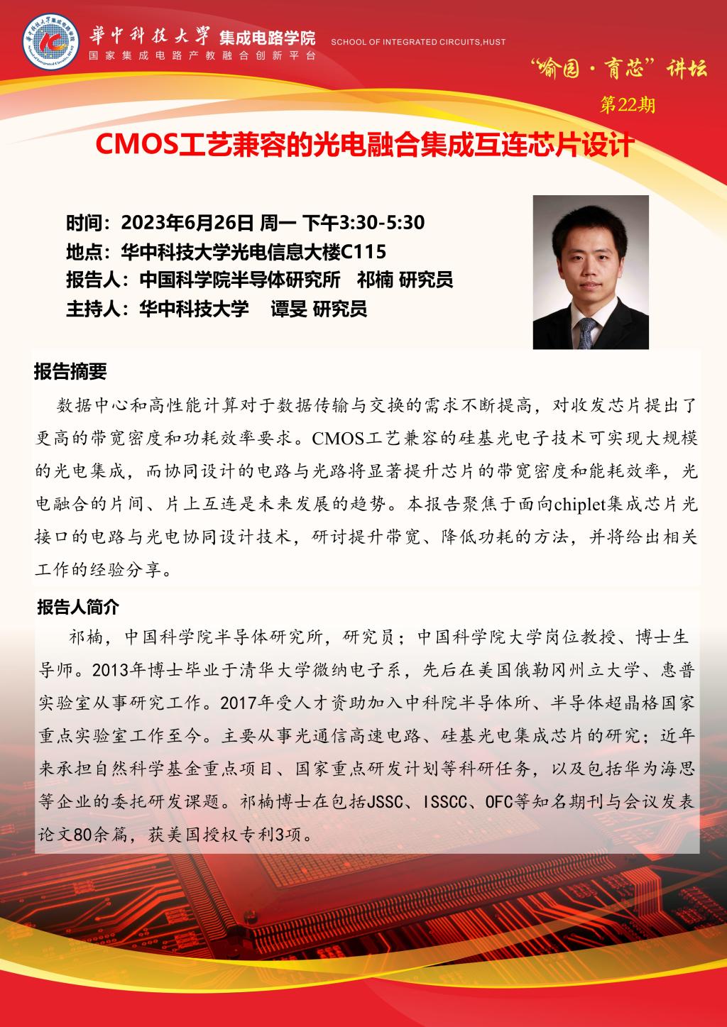 喻园•育芯讲坛第22期:CMOS工艺兼容的光电融合集成互连芯片设计