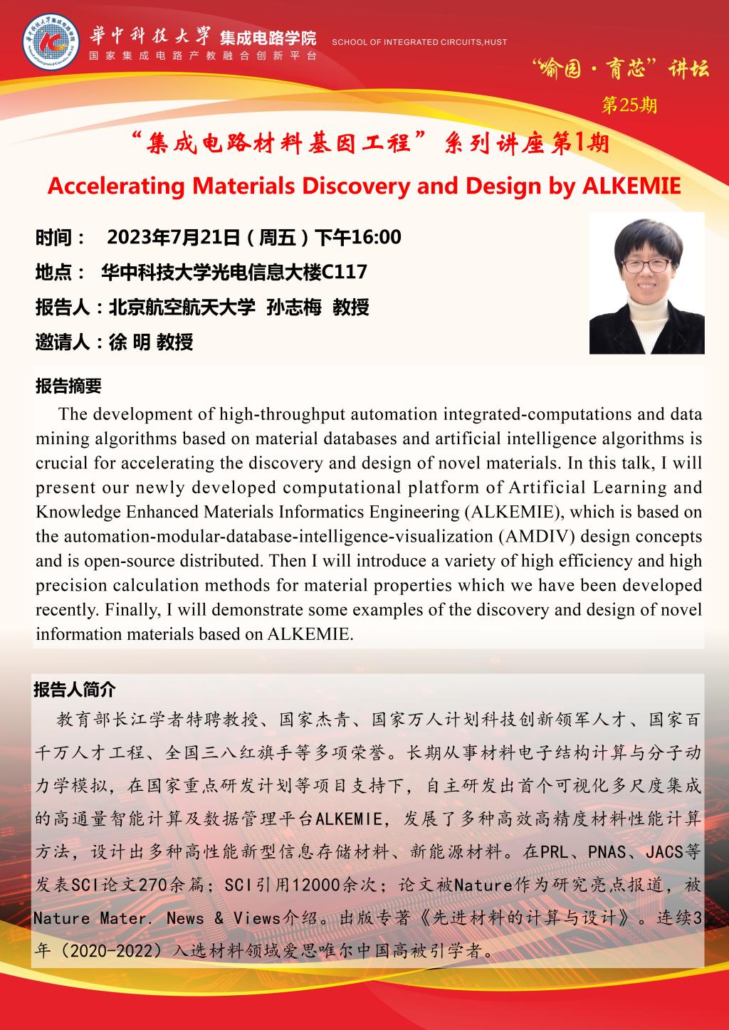 喻园•育芯讲坛第25期—“集成电路材料基因工程”系列主题讲座第1期:Accelerating Materials Discovery and Design by ALKEMIE
