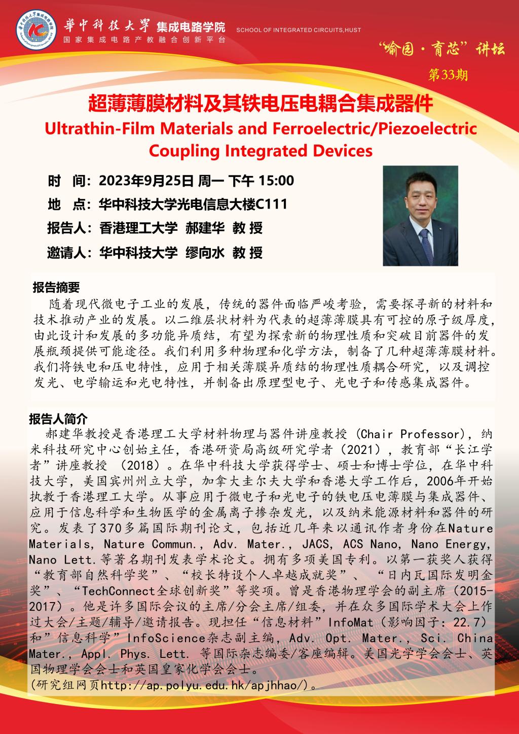 喻园•育芯讲坛第33期:超薄薄膜材料及其铁电压电耦合集成器件