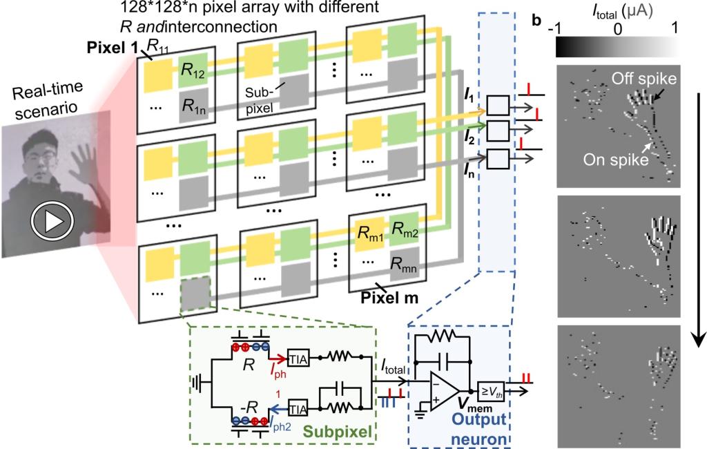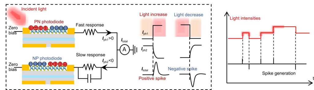 本研究工作受近年出现的一种新型传感器即“动态视觉传感器”启发,构建了基于分裂式浮栅WSe2晶体管的差分对单元,由此获得了仅对光强变化敏感而对静态光场无响应的光电传感单元,该单元对光强增大或减小分别产生正、负脉冲响应: