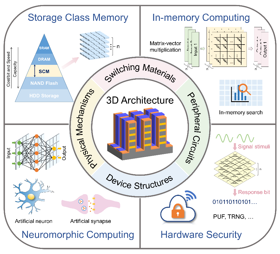 图1 三维集成自整流忆阻器的应用方向,如高密度存储、存内计算、神经形态计算、硬件安全等