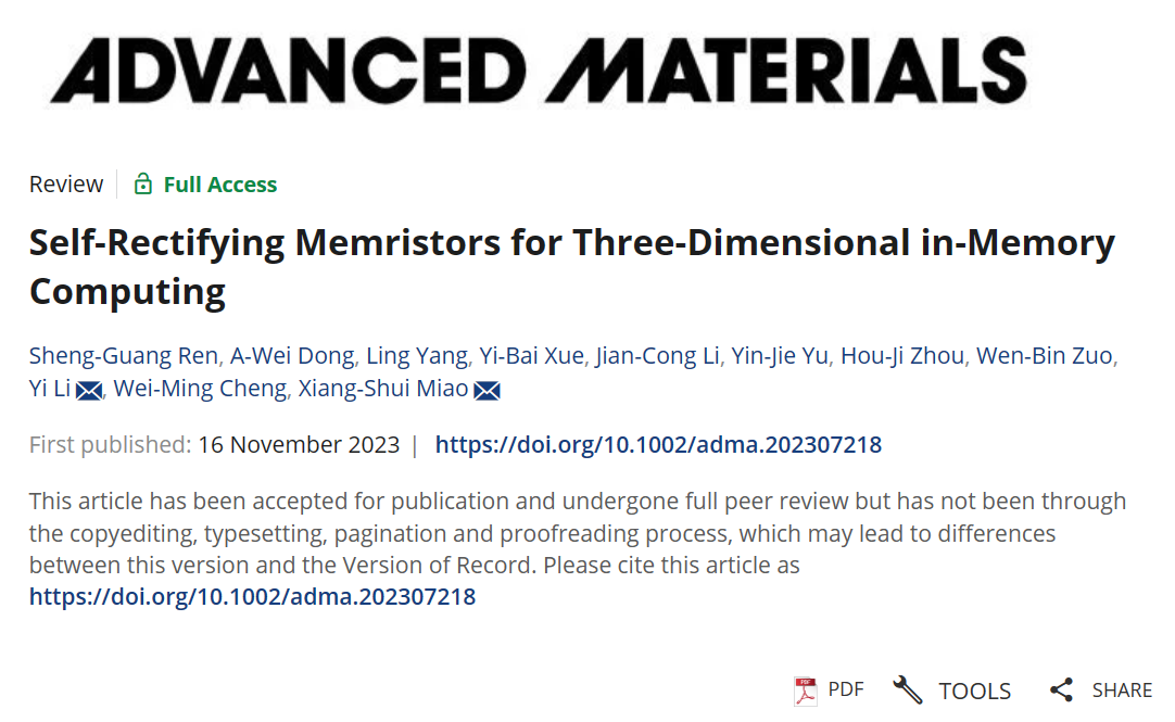 11月16日,《先进材料》(Advanced Materials)在线发表了williamhill中文缪向水教授团队关于忆阻存算一体技术的综述论文,文章标题为“Self-rectifying memristors for three-dimensional in-memory computing”。博士生任升广为论文第一作者,李祎副教授和缪向水教授为论文共同通讯作者。