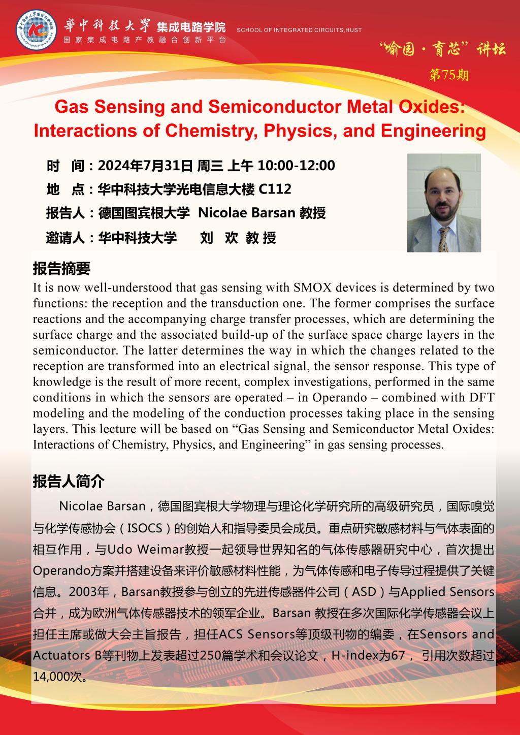 喻园•育芯讲坛第75期 : Gas Sensing and Semiconductor Metal Oxides: Interactions of Chemistry, Physics, and Engineering