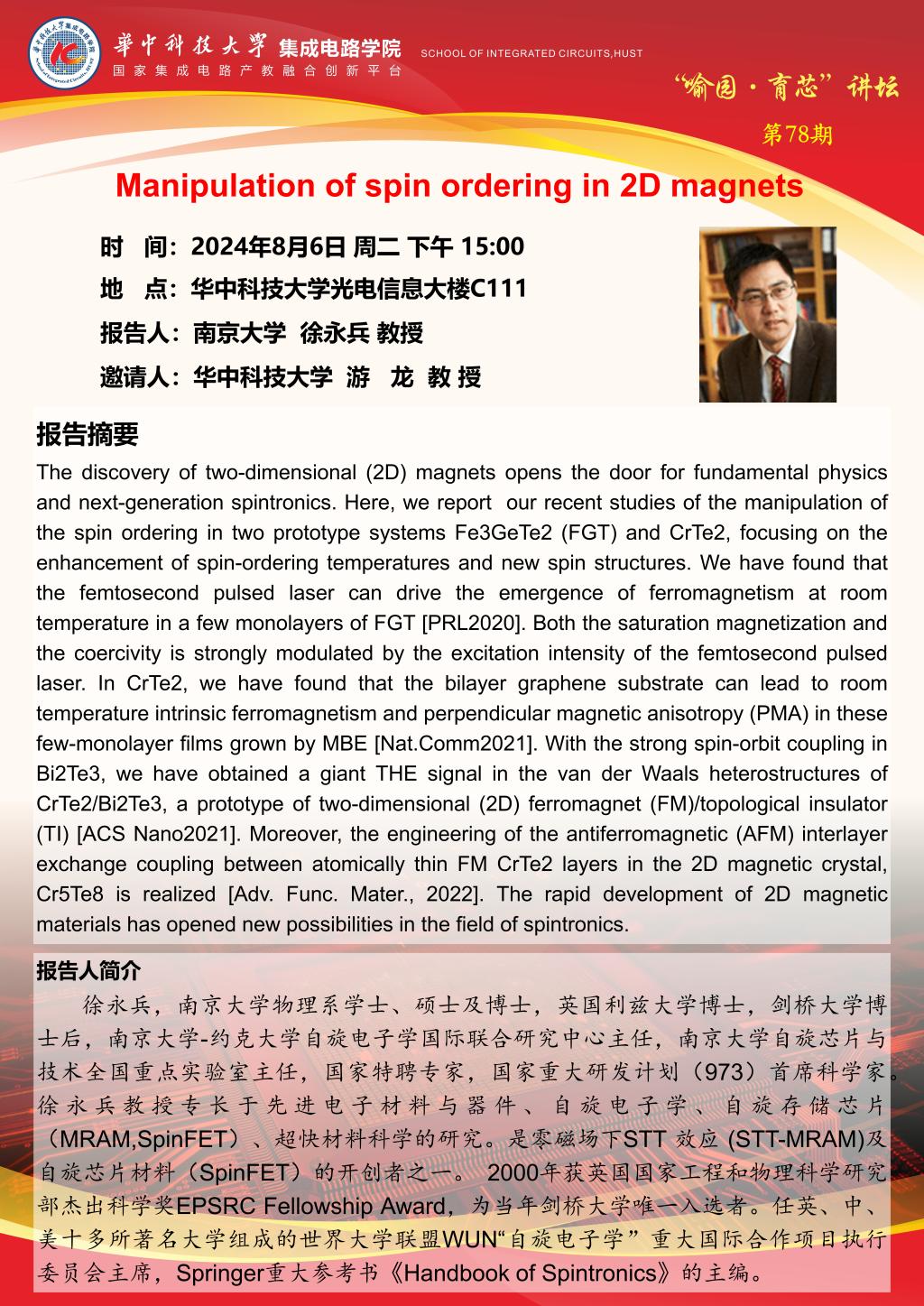 喻园·育芯讲坛第78期:Manipulation of spin ordering in 2D magnets