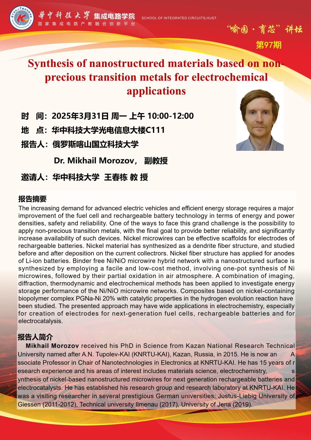 喻园•育芯讲坛第97期:Synthesis of nanostructured materials based on non-precious transition metals for electrochemical applications