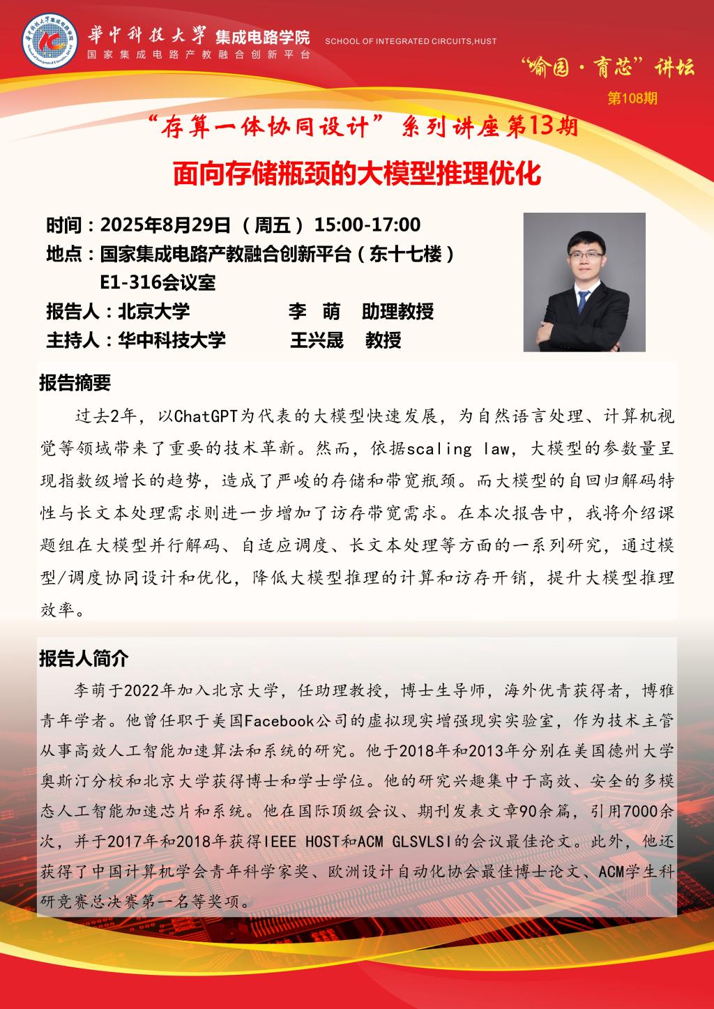 喻园•育芯讲坛第108期—“存算一体协同设计”系列讲座第13期:面向存储瓶颈的大模型推理优化
