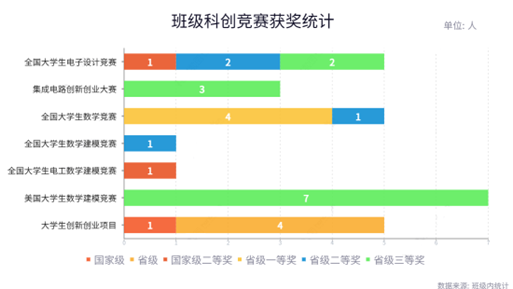 进实验室做科研、参加专业竞赛、加入大创项目是他们的必修课。全班共有15位同学参加了大创项目,6位同学加入实验室参与项目。其中国家级大创项目1项,省级大创项目4项。此外,他们也积极加入大学生公共项目实验室,电工基地,双创融合平台等科研实践基地。在全国大学生电子设计大赛中,有1名同学所在队伍斩获国家级二等奖,2名同学所在队伍获得省级二等奖,2名同学所在队伍获得省级三等奖。此外全国大学生数学竞赛省一等奖4人次,美国大学生数学建模大赛S奖7人次,全国大学生数学建模比赛省二等奖1人次。总计获得竞赛奖项高达25项!
