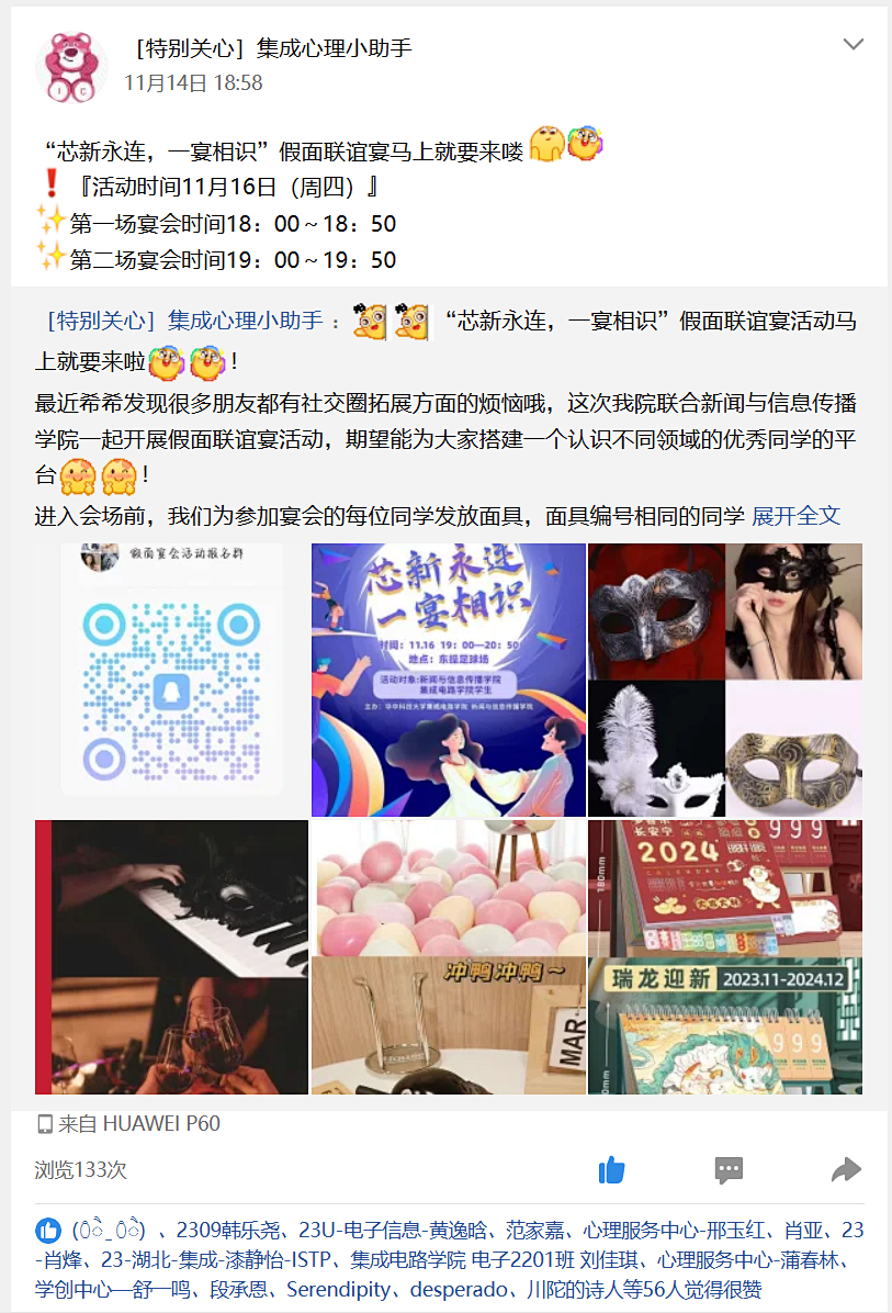 从构思到筹划,从准备到行动,集电与新闻两院的心理服务中心穷其所思、竭其所能,为此次假面联谊宴的顺利举行尽心尽力。