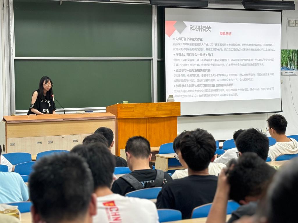 5月18日晚,本科2023级召开本学期第3次年级大会暨典型学子报告会,微电子专业本科生党支部组织委员、2023年国家奖学金获得者朱晴同志做分享。