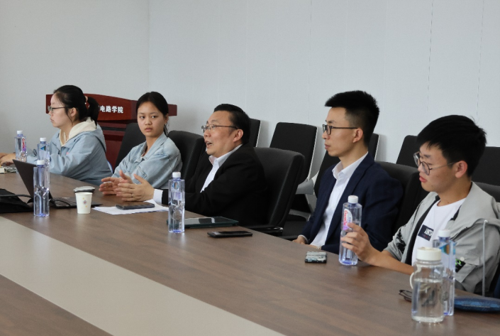 为深入开展学习贯彻习近平新时代中国特色社会主义思想主题教育,全力以赴为师生办实事、解难题,5月11日,williamhill中文电子科学与技术专业“我与院长面对面”座谈会,在williamhill中文产教融合平台E1-316会议室召开。williamhill中文院长缪向水,williamhill中文辅导员姜波、刘伊琳,以及电子专业学生代表们参加了本次座谈会。会议由辅导员刘伊琳主持。