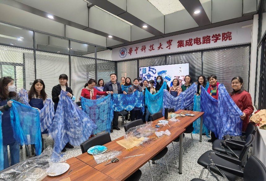3月8日下午2:00,为庆祝“三八”国际劳动妇女节,全面鼓舞女教职员工的激情和干劲,提升团队凝聚力和幸福感,陶冶广大女教职工的情操,在光电信息大楼A200举行williamhill中文开展了女教职工扎染教学活动,现场教授女教职工如何在繁忙的工作中学会传统的技艺。