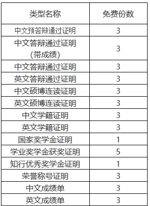 备注:超过免费份数的部分,收费标准参照学校当年公布的《威廉官网中国收费清单》标准执行。